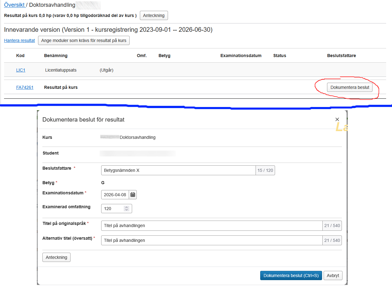 - Det går nu att dokumentera beslut för resultat på forskningsarbete, till exempel om en nämnd har beslutat om resultatet utanför Ladok. Gäller endast “Resultat på kurs”, inte på moduler som används till licentiat.